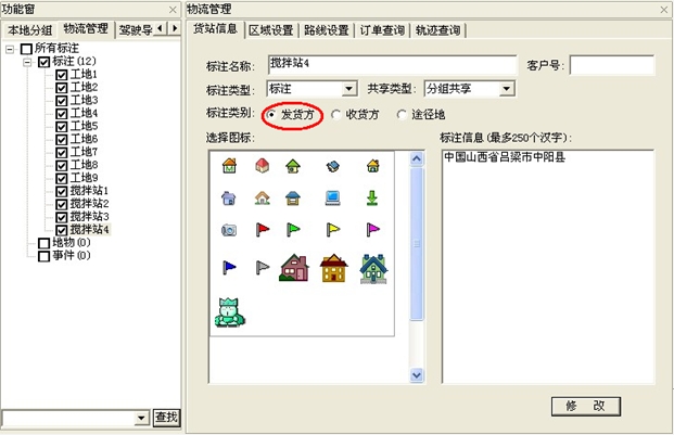 ,在弹出的"物流管理"对话框中选择"货站信息",选择图标。(注:标注类别选择"发货方")如下图: