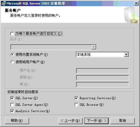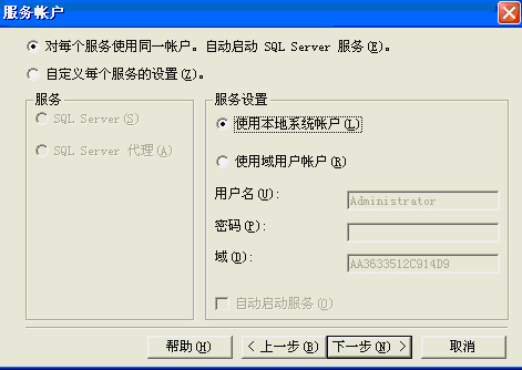 13. 选择“使用本地系统帐户”,单击【下一步】按钮进入下一界面: