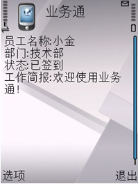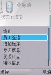 4)签退:下班时,业务员用手机签退,在业务通桌面选择“选择 ---> 员工签退”,进入员工签退界面,如下图: