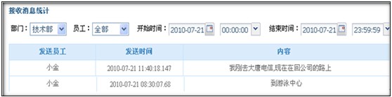 发送成功后,平台接收信息统计中显示发送者的名字,发送时间,内容等信息。 如下图: