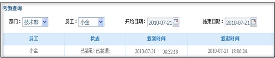 签退成功后,平台报表考勤查询中显示此业务员一天中的签到签退时间。如下图: