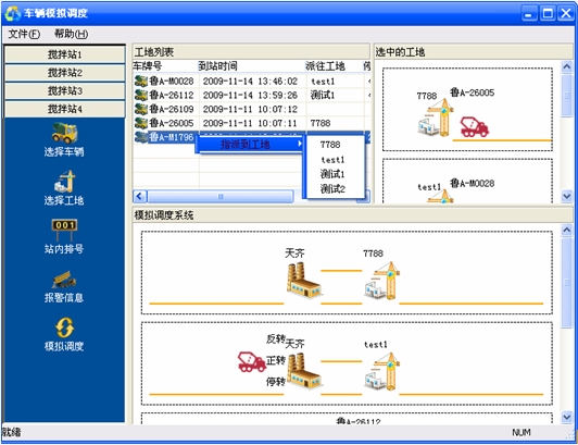 Ⅰ.在选中的车辆列表栏中,在派遣的车辆上点击右键,选择派往的工地,或者直接用鼠标拖动该车辆进入"选中的工地"模块中的工地即可。(如下图:)