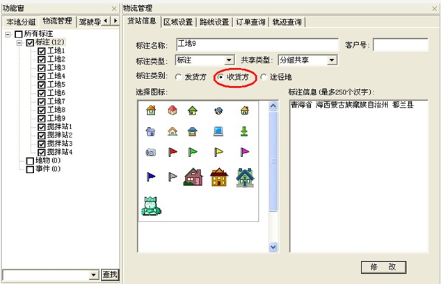 ,在弹出的"物流管理"对话框中选择"货站信息",选择图标。(注:标注类别选择"收货方")如下图: