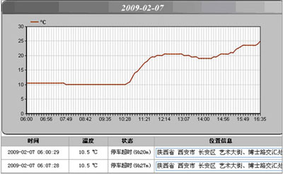 以表格的形式显示出 车辆在一天内的温度值,对从事特殊行业运营的车辆(比如冷藏车)温度进行监控 。