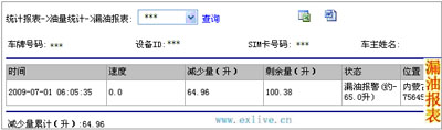 3>. 漏油报表:统计车辆在某一段时间内的漏油记录,包含时间,油箱内的油减少量,剩余油量,当时车辆的位置等。
