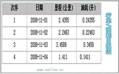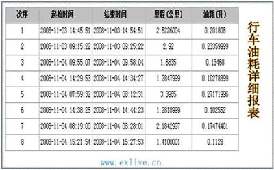 4>. 行车/油耗报表: 记录车辆在某一段时间内每次行驶,里程和油耗的对比关系图,并可转化成文字报表形式保存。