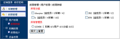 注意: 1.接受的下级管理员拥有的分组、车辆、用户权限空闲数量不能小于要转入分组的用户和车辆数。否则不能成功转移,系统会提示“目标用户车辆(或者用户)数量不足”。