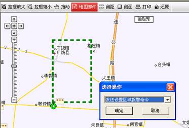 在地图中拖动鼠标画出车辆行驶的区域范围,此时地图中会以绿色方框显示(需要修改或取消操作时,再次点击