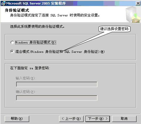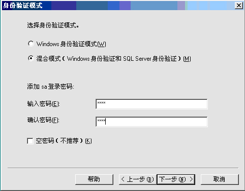 14. 选择“混合模式(Windows身份验证和SQL Server身份验证)”如下界面所示: