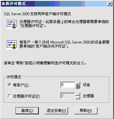 17. 在许可模式的“每客户(S)”中输入“5”,单击【继续】将自动安装本系统。安装完成后单击完成按钮即可。