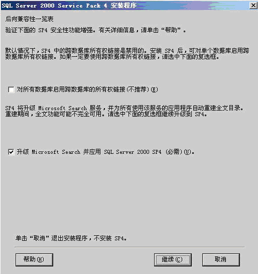 8. 选择“升级Microsoft Search并应用SQL Server 2000 SP4(必需)(U)”,单击“继续(C)”,显示界面如下: