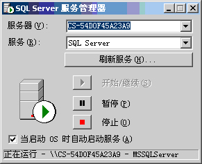 重新启动Windows系统,若安装成功重新启动后会在计算机的右下角出现一图标 。若为绿色则正确,否则要单击:“开始” ——> “程序” ——> “MicroSoft SQL Server” ——> “服务管理器”进入如下界面: