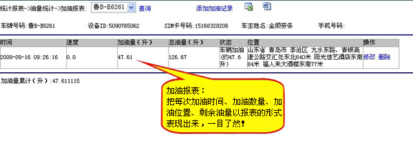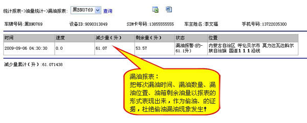 实时监控油箱油量变化,每月加油次数统计、加油量统计、加油时间统计、加油地点统计。漏油时间统计、漏油地点统计,漏油油量统计,杜绝偷油卖油现象发生!