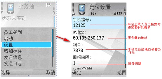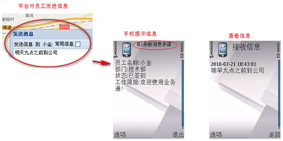 智能手机安装“业务通”定位软件,通过定位平台可查看业务员的实时位置,历史轨迹,业务员可以通过手机向平台签到、签退、用手机向平台发送地图标注,和平台相互发送信息,下班前向平台发送工作日志等。