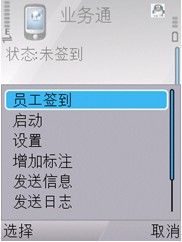 4)签退:下班时,业务员用手机签退,在业务通桌面选择“选择 ---> 员工签退”,进入员工签退界面,如下图: